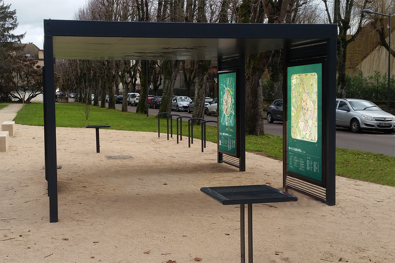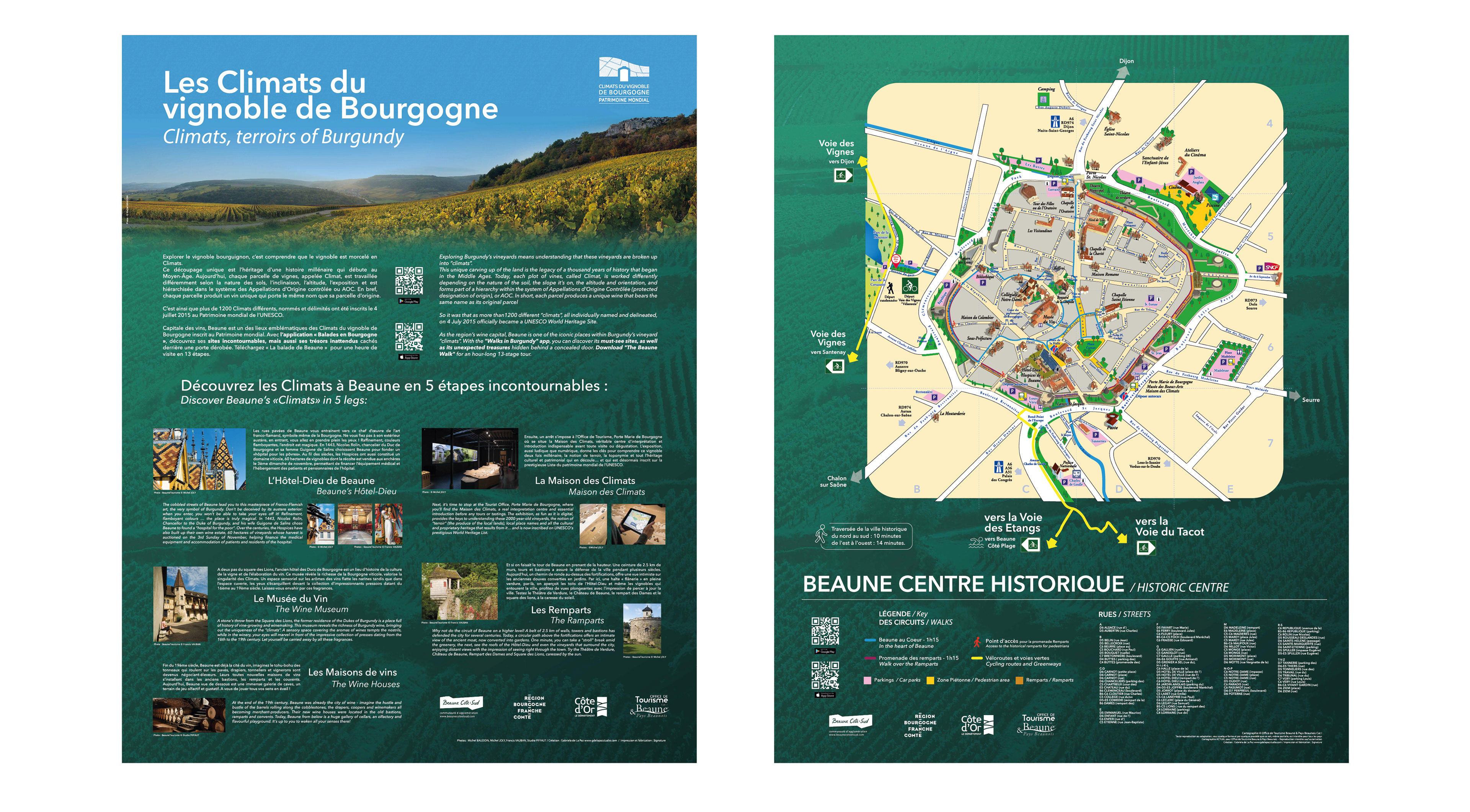 Conception de panneaux touristiques et informatifs destinés aux visiteurs souhaitant découvrir Beaune et la région de Bourgogne à vélo. Client : Société Signature