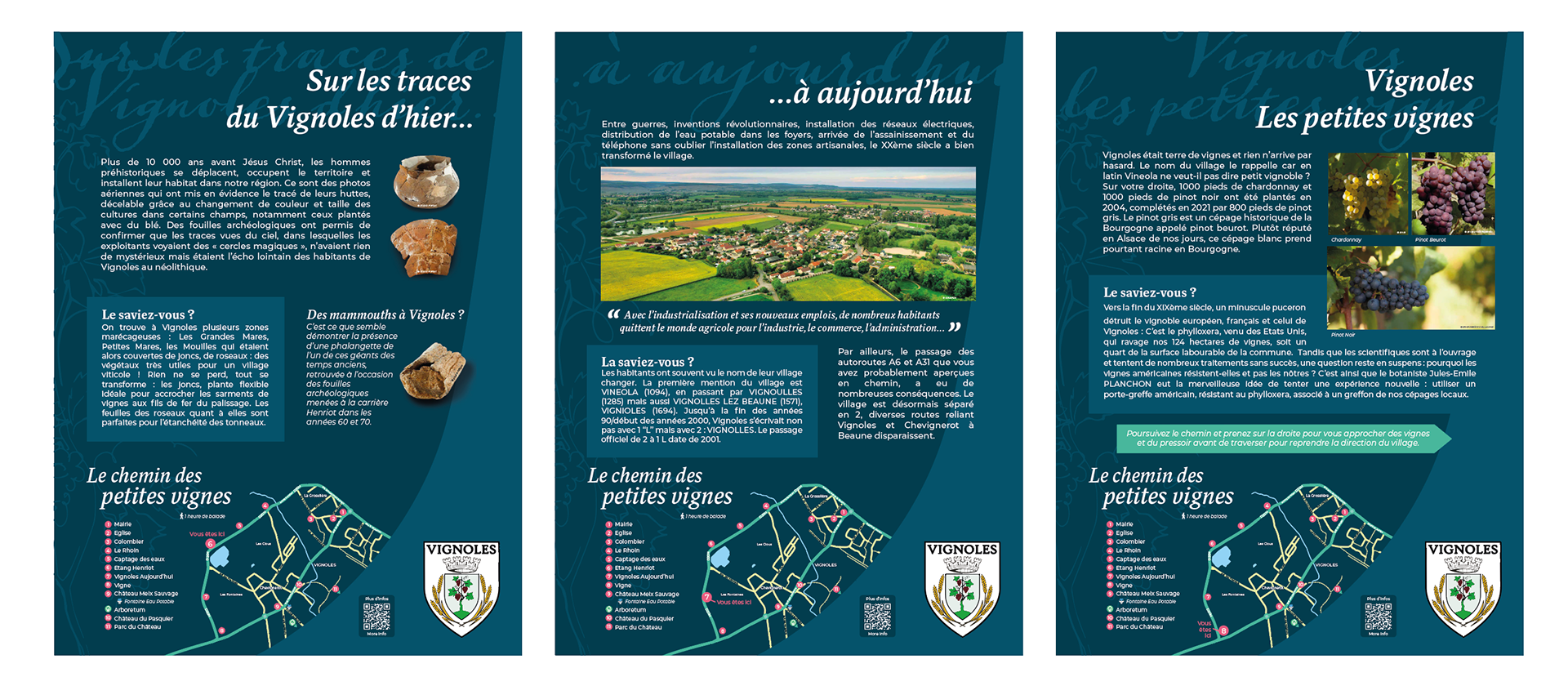 Conception d'un ensemble de onze panneaux pour le circuit touristique de la commune de Vignoles, destinés à mettre en valeur son histoire et sa richesse culturelle. Client : Commune de Vignoles